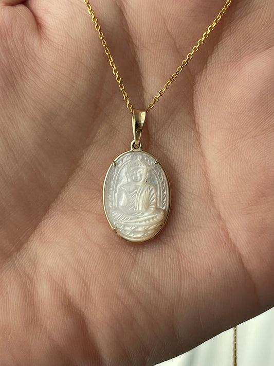 Mother of Pearl Oval Cabochon Buddha Pendant 18k Gold