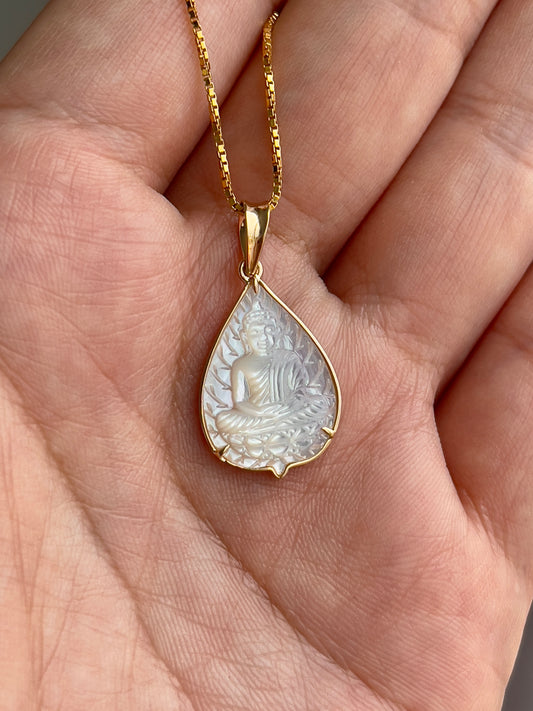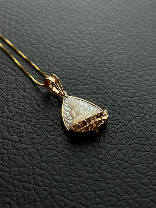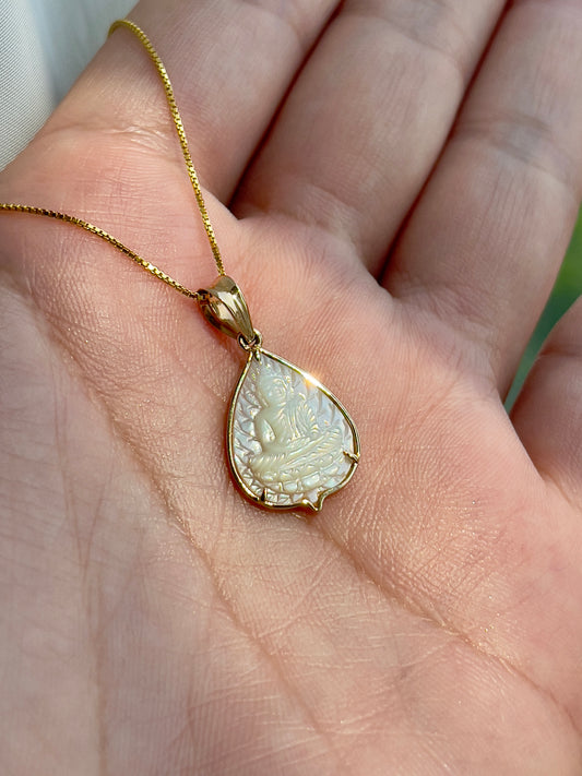 Mother of Pearl Banyan Leaf Buddha with Gold Lotus Pendant 18k Gold