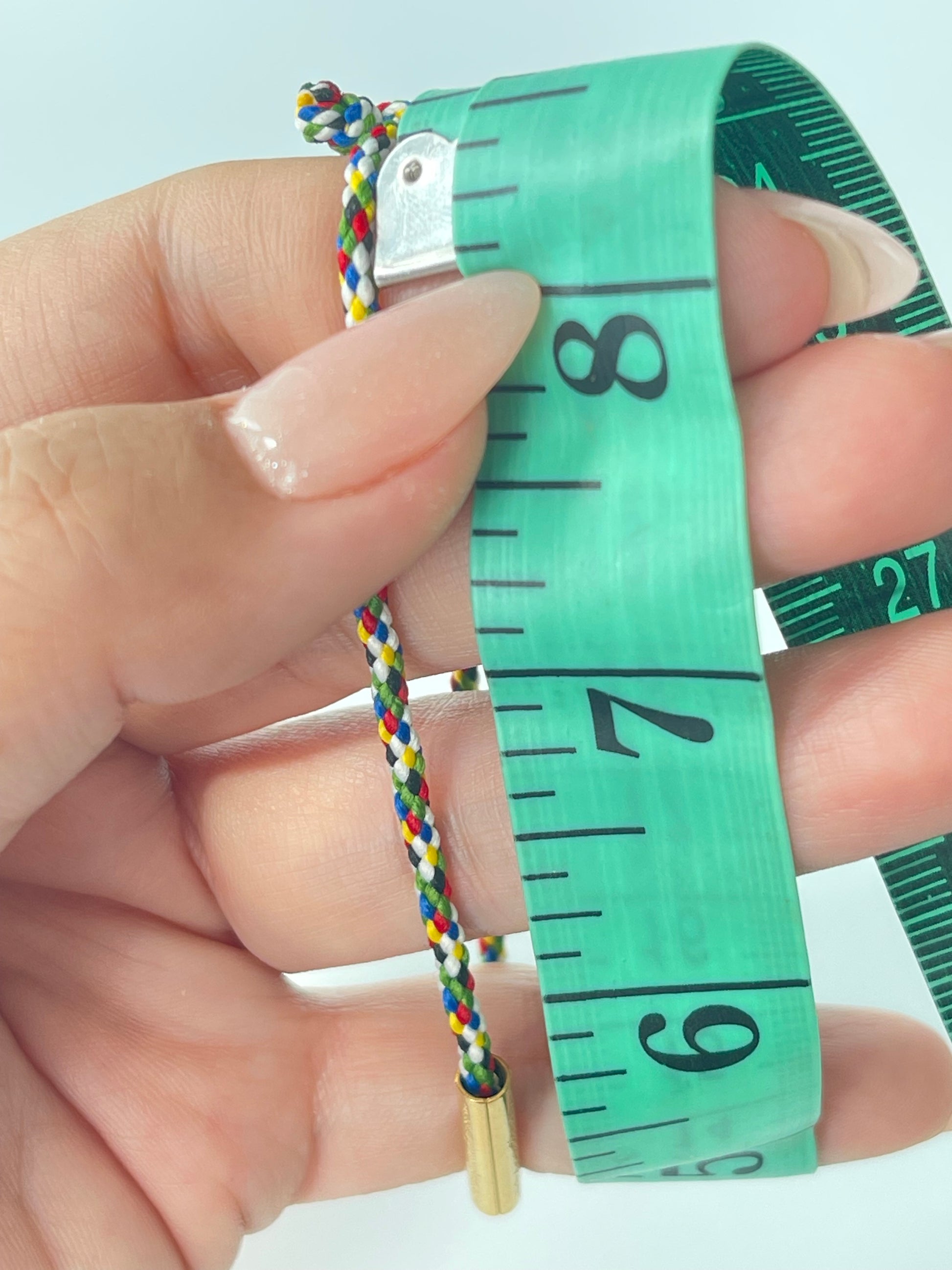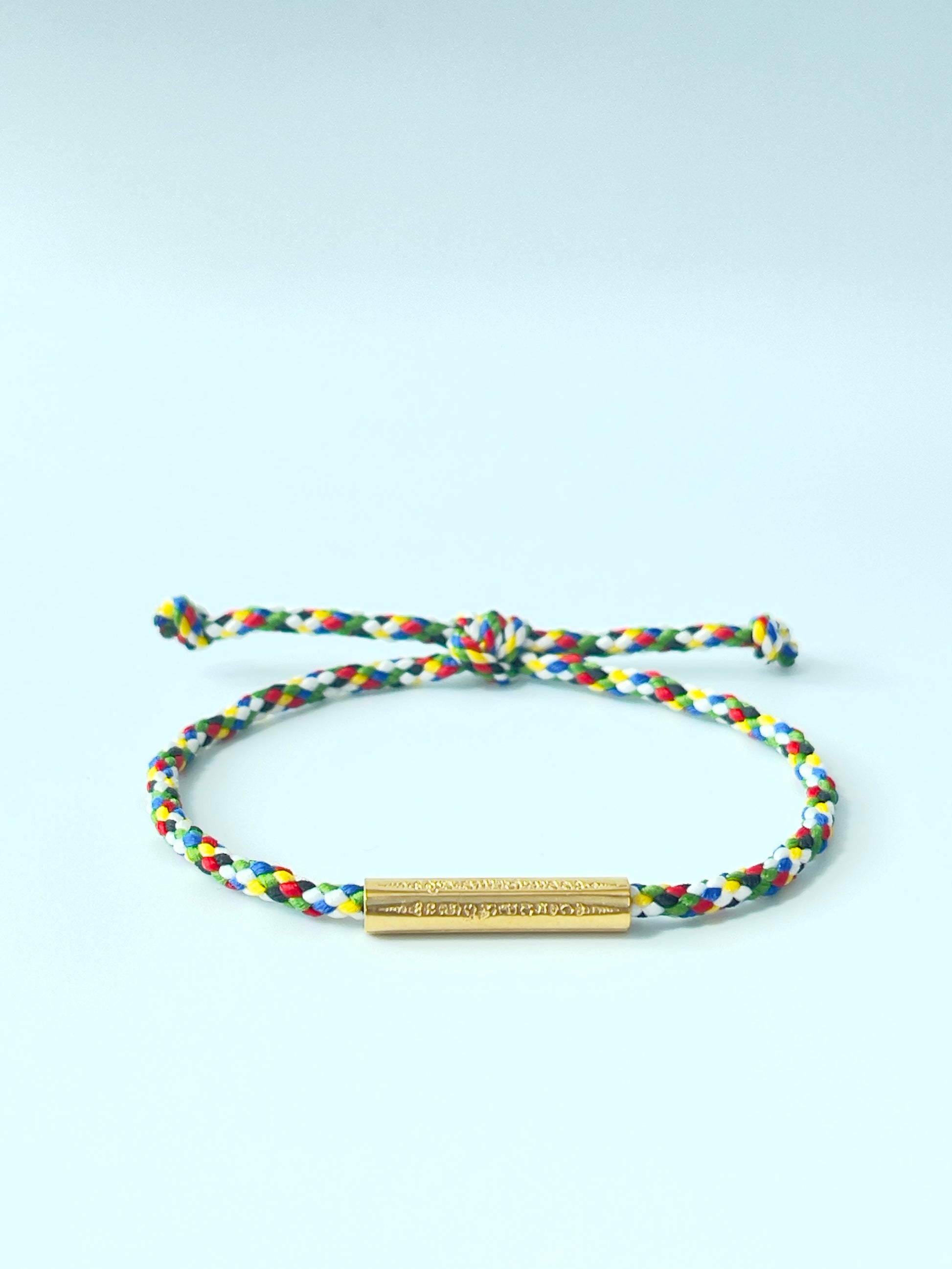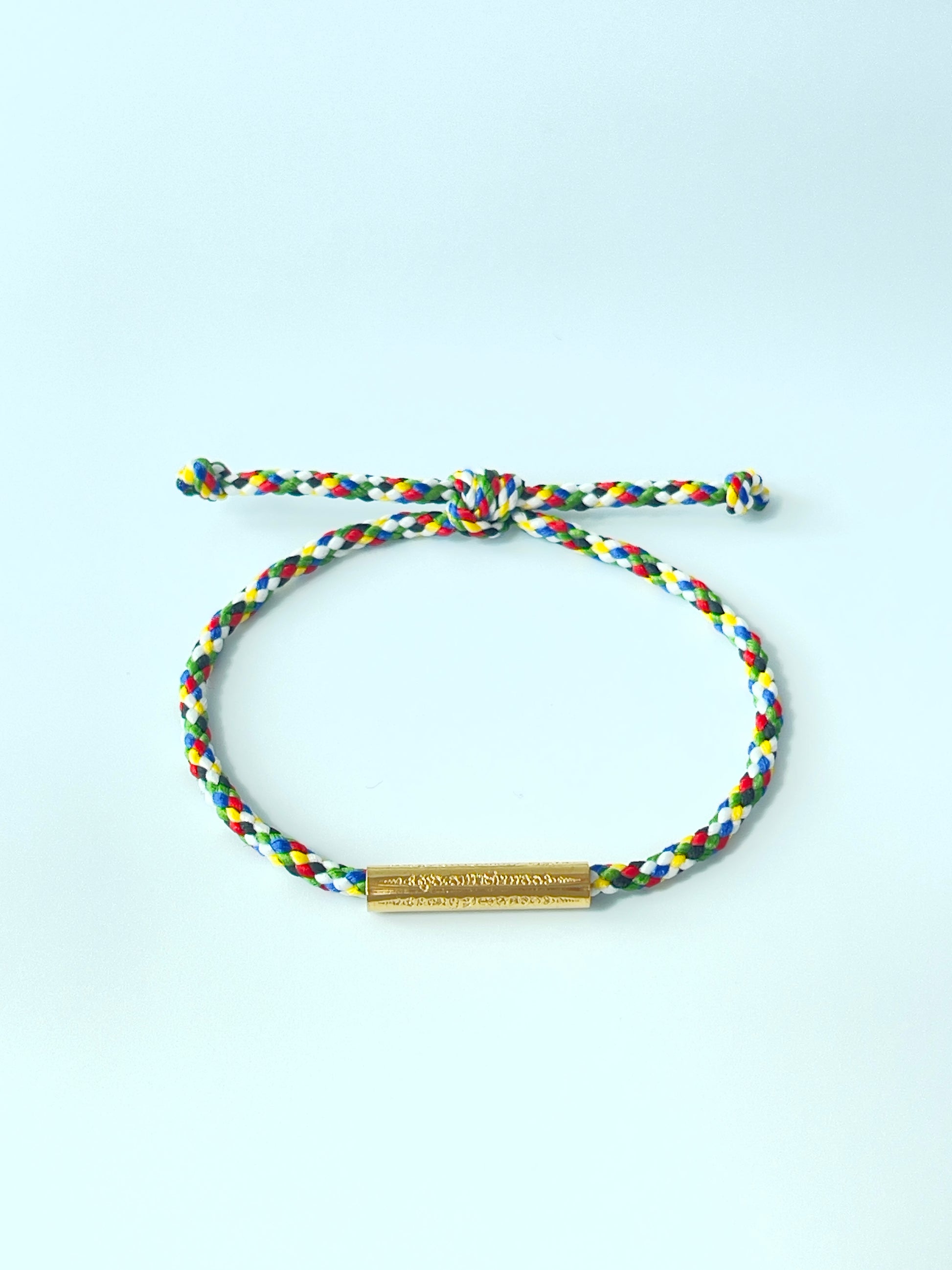 A fun, blue & multi-color adjustable children's cord bracelet: features a single sliding knot enclosure that stretches out to 8 inches in circumference that you can cinch back down to your child's wrist size. The gold color "katha," which is the engraved metal cylinder, measures approximately 0.75 inches - a smaller and thinner version of the adult sacred yantra bracelets.