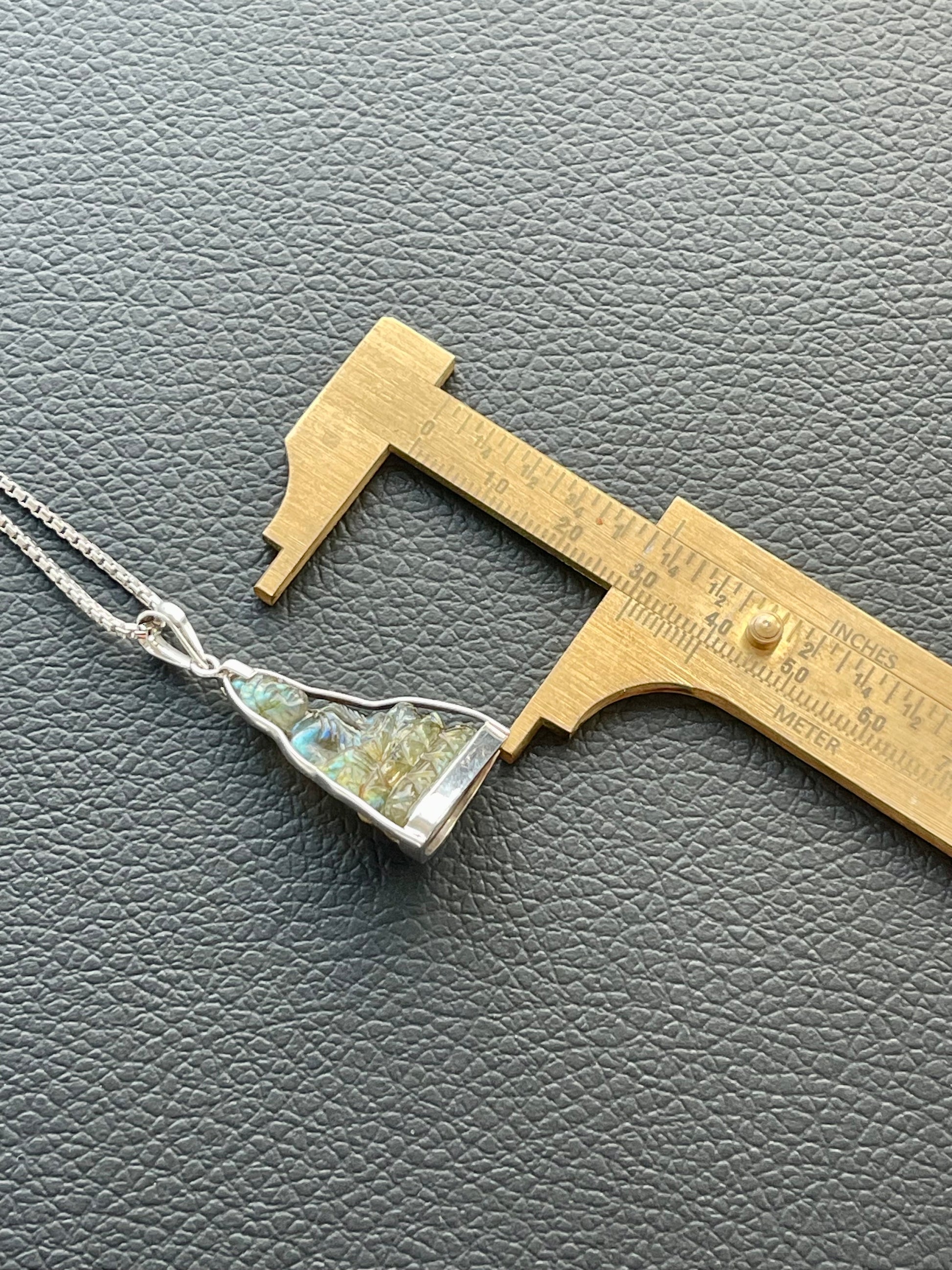Graceful and grounding, this hand-carved Buddha pendant is crafted from flashy gray labradorite, a stone known for its iridescent light and deep spiritual resonance. This one-of-a-kind Buddha pendant has a unique play of color and a quiet shimmer as it catches the light.