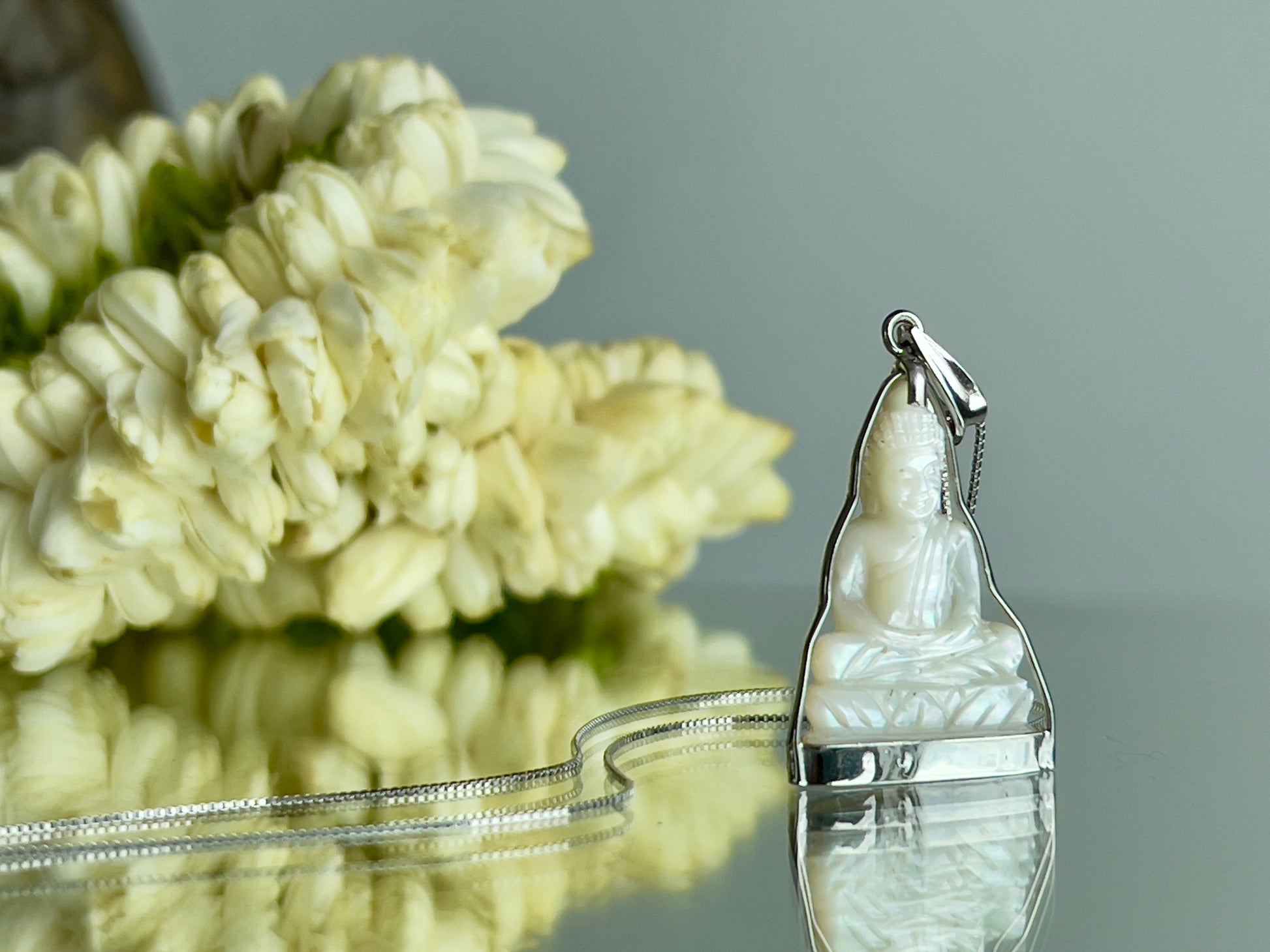 Gracefully carved from lustrous white Mother of Pearl, this 1.25-inch tall Buddha pendant radiates purity and serenity. This piece is hand-carved in Cambodia by expert artisans in the traditional Khmer style, honoring centuries of craftsmanship and devotion. The delicate yet striking pendant is mounted in sterling silver and paired with a 20-inch silver chain, weighing a refined 12.70 grams, comfortable for daily wear.