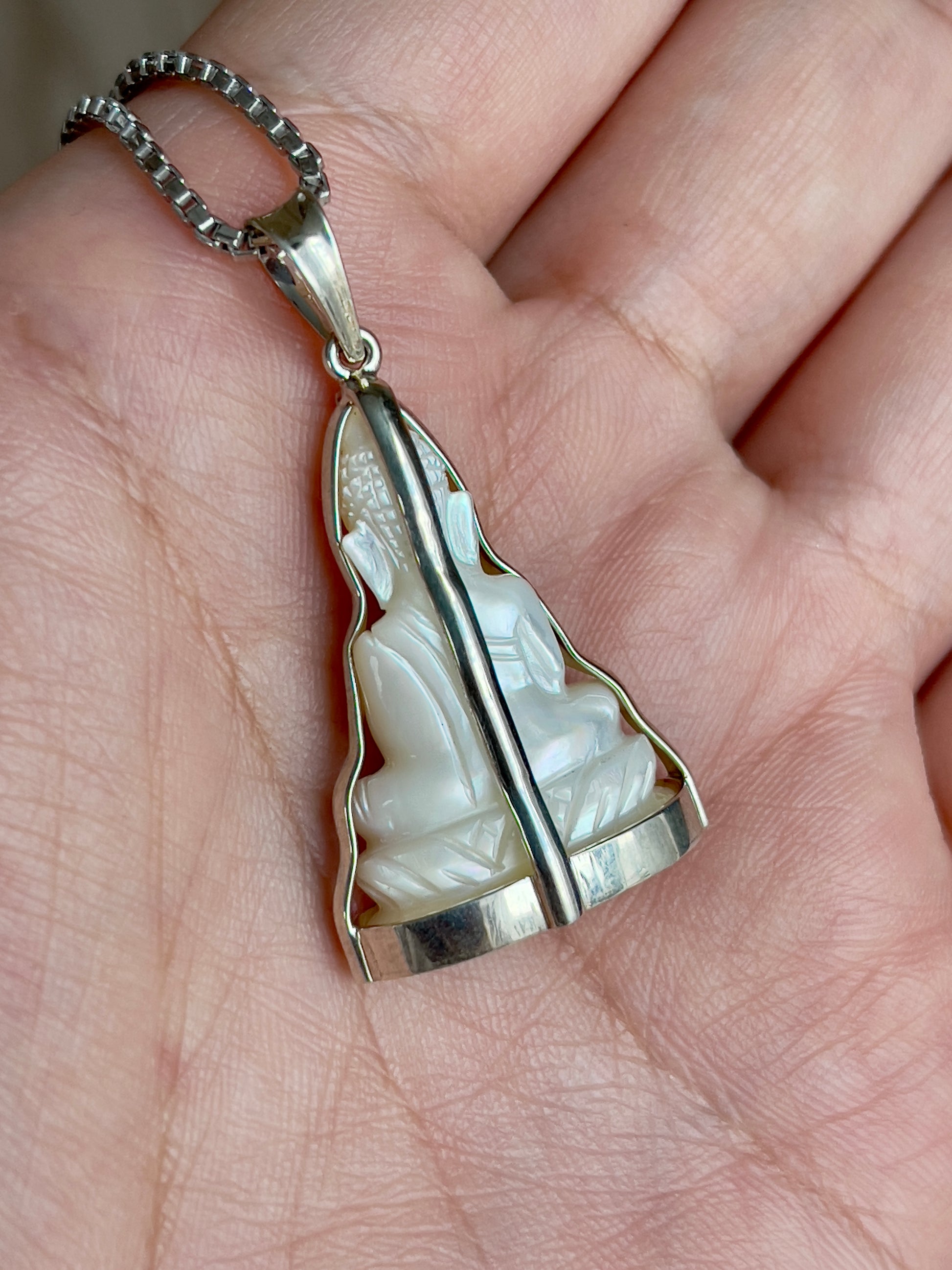 Gracefully carved from lustrous white Mother of Pearl, this 1.25-inch tall Buddha pendant radiates purity and serenity. This piece is hand-carved in Cambodia by expert artisans in the traditional Khmer style, honoring centuries of craftsmanship and devotion. The delicate yet striking pendant is mounted in sterling silver and paired with a 20-inch silver chain, weighing a refined 16.40 grams, comfortable for daily wear.