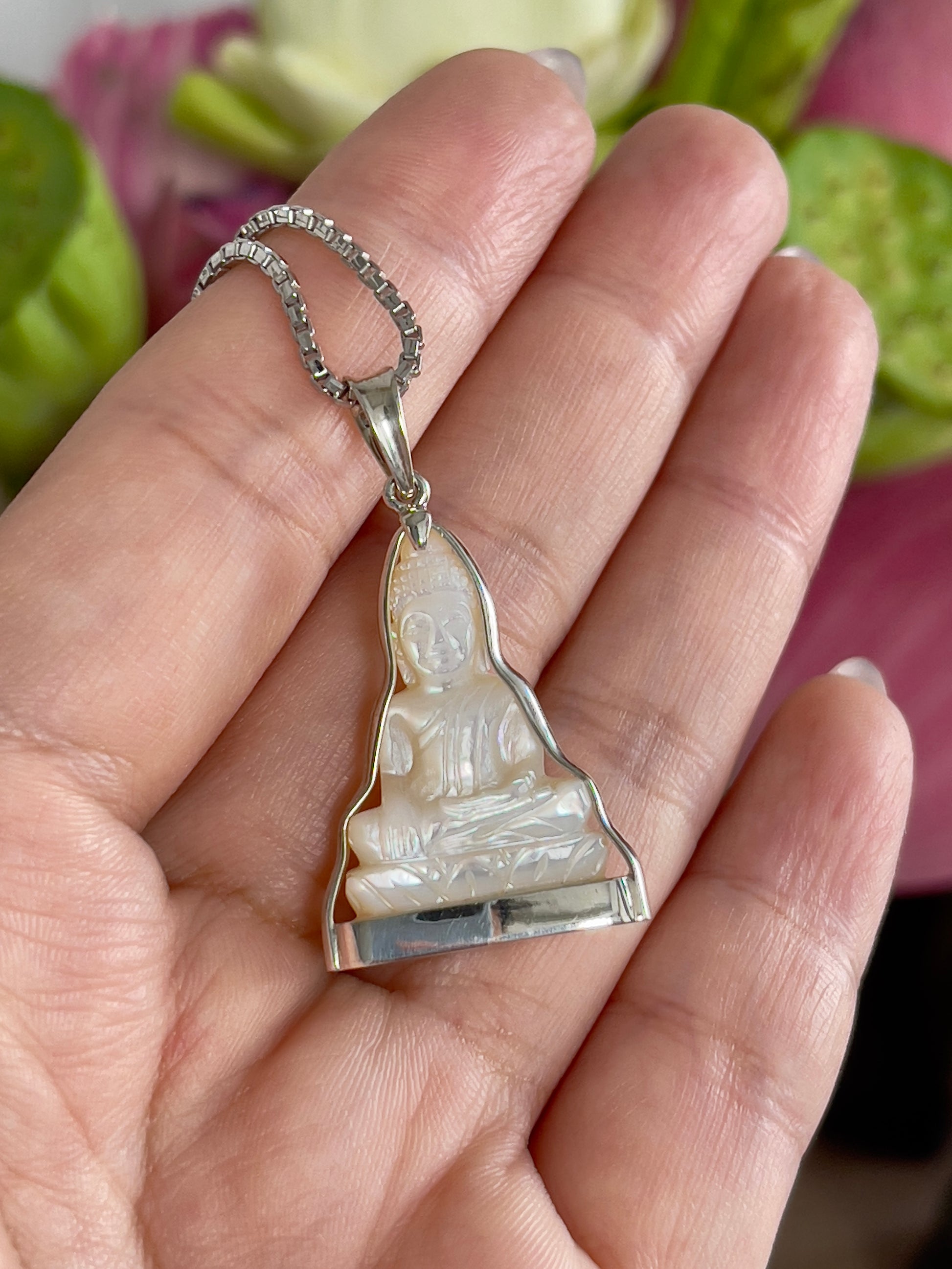 Cherished for its luminous surface and symbolic ties to peace, protection, and balance, Mother of Pearl beautifully complements the serene image of the Buddha. Elegant and meaningful, this pendant makes a thoughtful gift for celebrating milestones, honoring new beginnings, or simply offering a timeless reminder of harmony and grace.